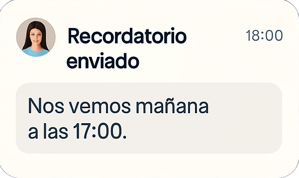 Mensajes automáticos antes y después de cada cita. Mejore asistencia, reduzca ausencias y aumente la recurrencia sin esfuerzo.